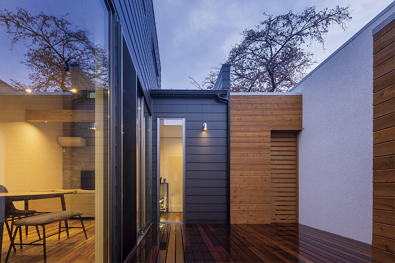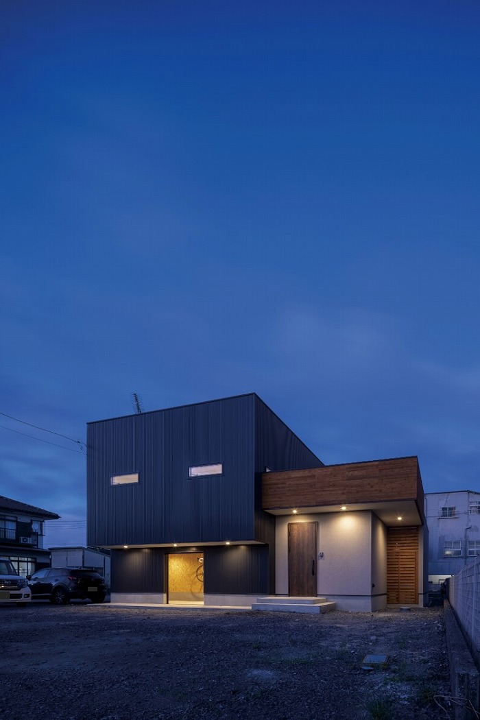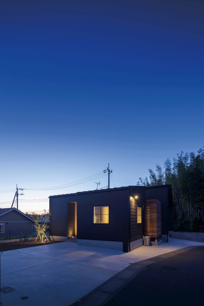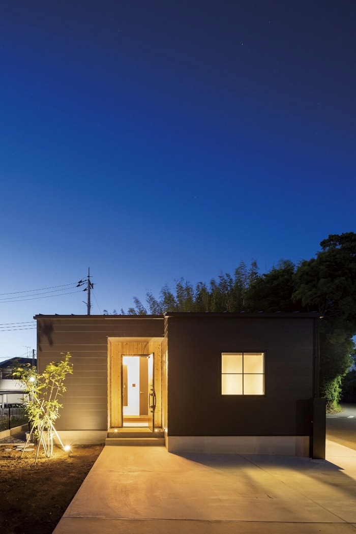 外壁は黒いガルバリウムをベースとし、無垢材のレッドシダーをアクセントに採用することで、どこか温もりを感じる外観に。夜間に光がもれる格子窓も建物にかわいらしい印象を与えてくれます。
