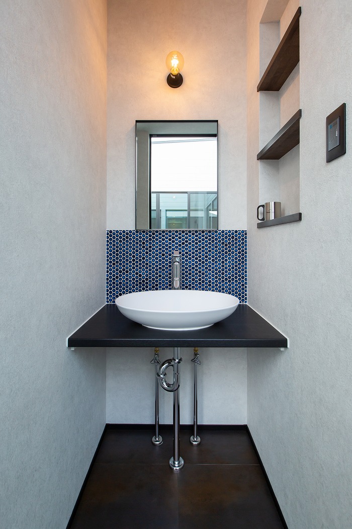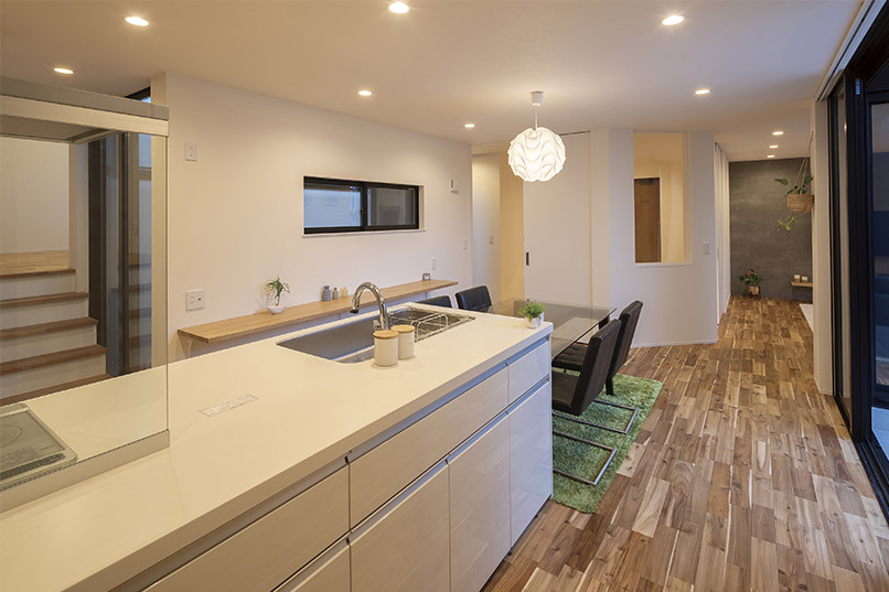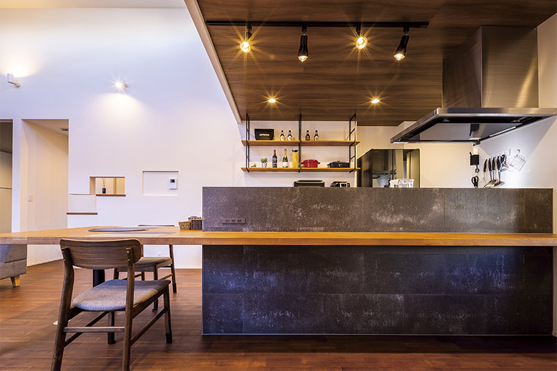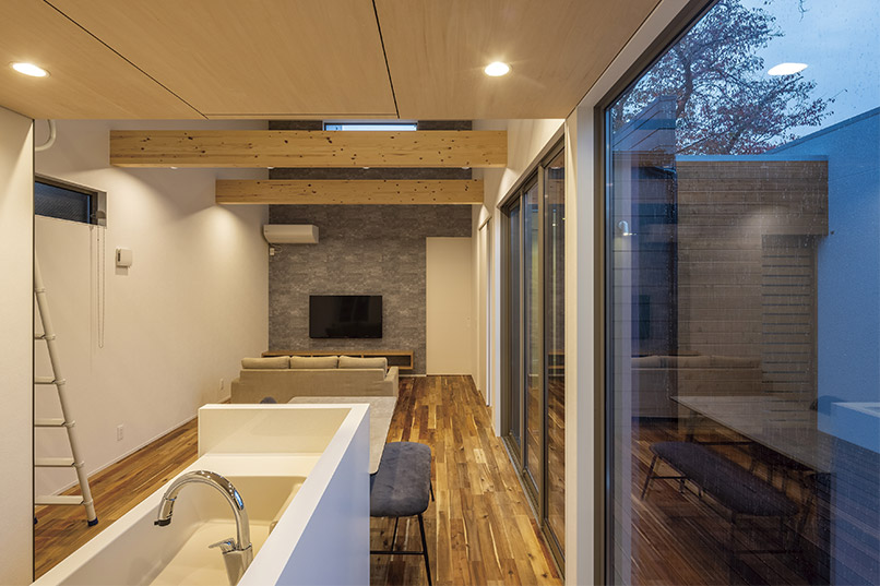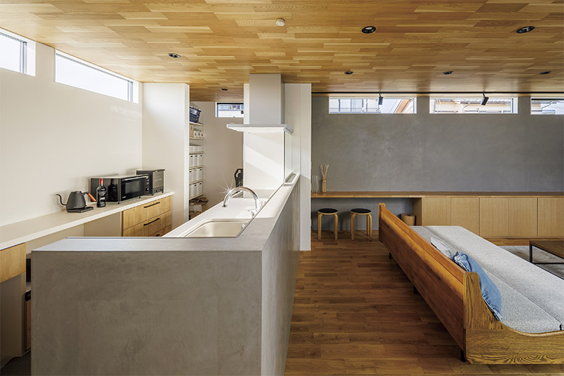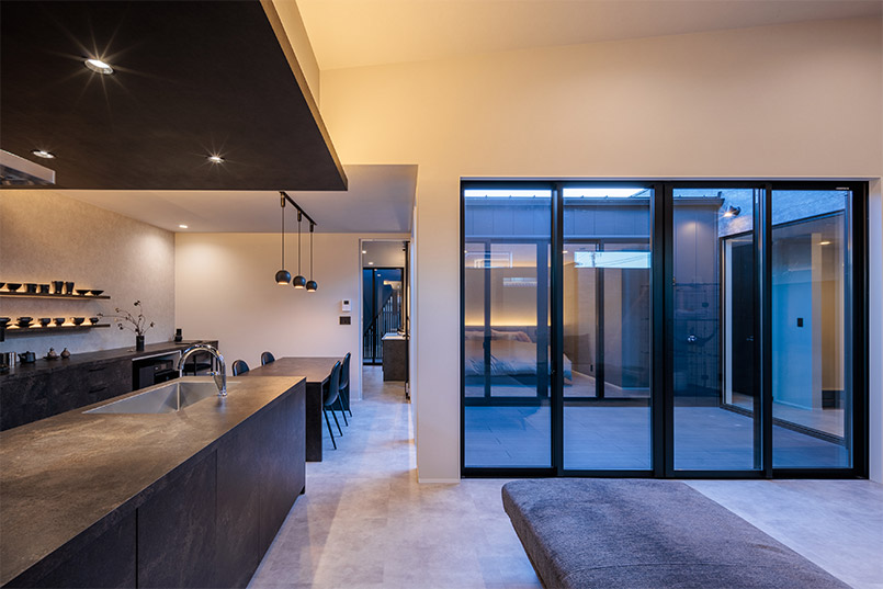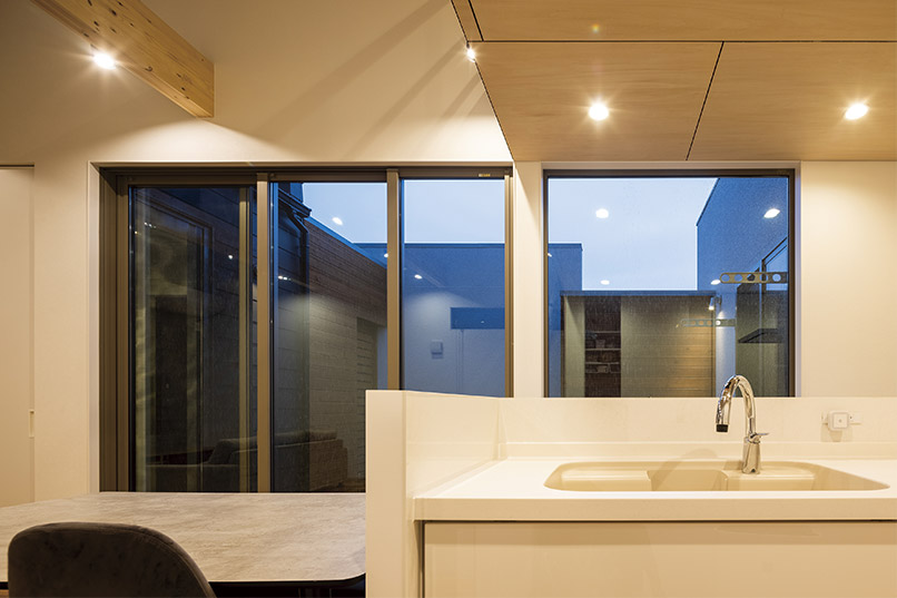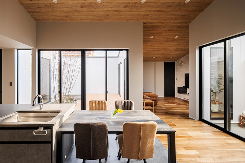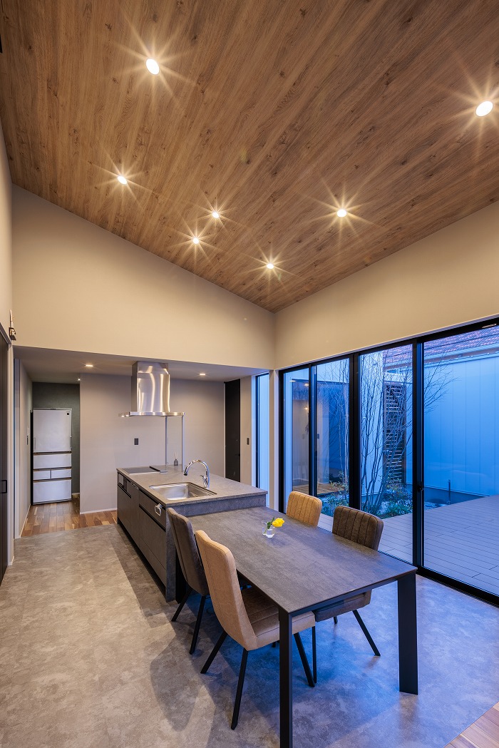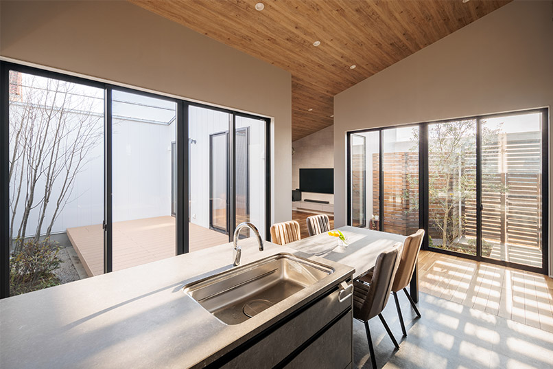 また、外部からの視線を遮るべく、中庭部分の壁の高さを調整し、カーテンの要らない生活を実現しました。外観の無機質な印象とは対照的に、キッチン部分にはコンクリート素材と木をふんだんに使い、シャープながら温かみのある空間とすることで、帰りたくなる我が家を実現しました。