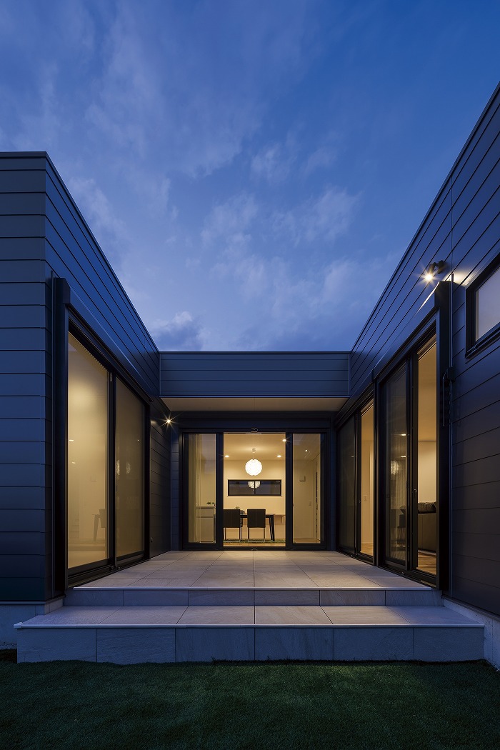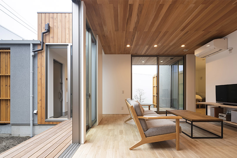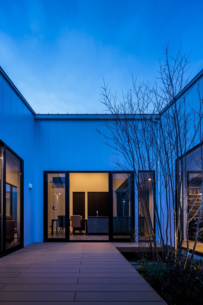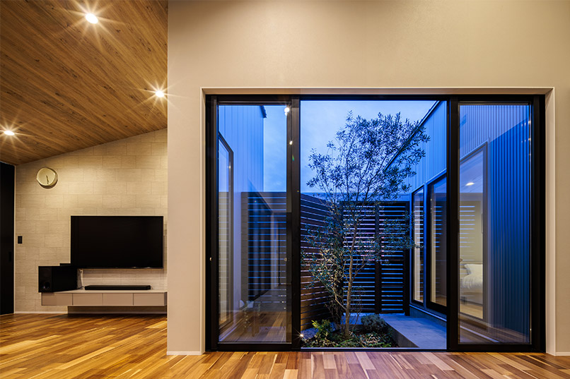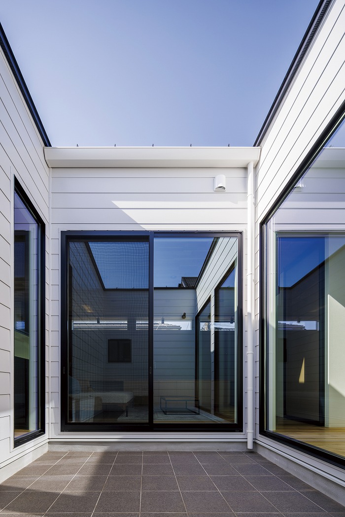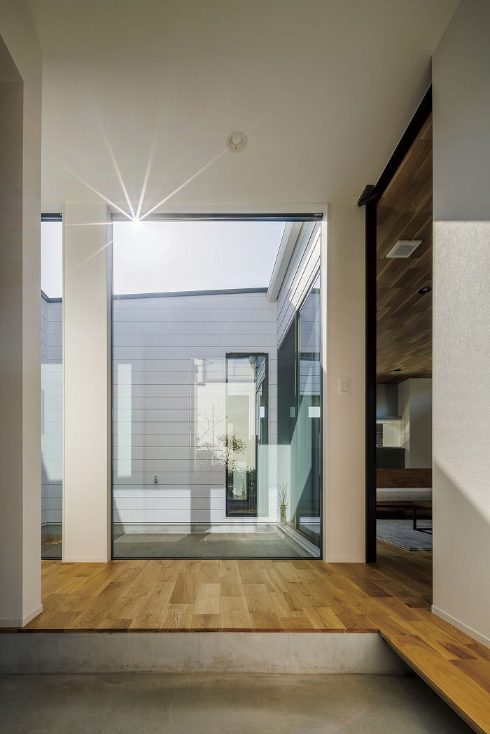 家の中央に配置された中庭が特徴的な家。採光性と通気性が確保できると同時に、カーテンがなくてもプライバシーが守られ、気持ちよく生活することができます。