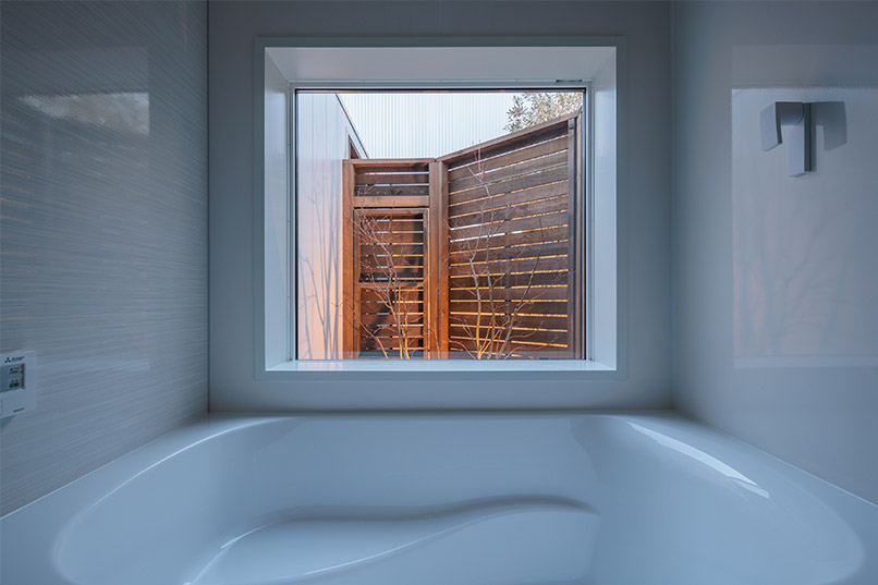 大胆にLDKを分断し、中庭を二箇所、リビングに吹き抜けを採用することで明るく圧倒的な開放感のある家を実現しました。風呂場に面した坪庭や、室内外が入り混じり自然と調和した間取りは、長い年月を過ごしても決して飽きることがありません。